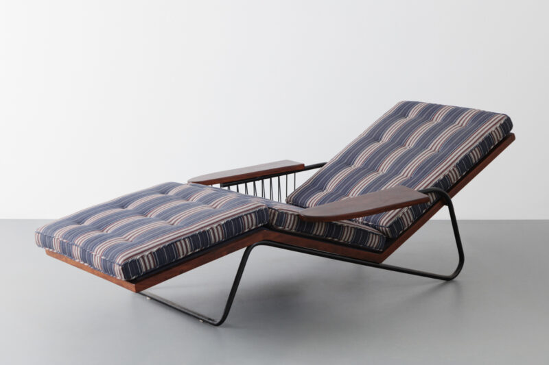 In addition to his mastery of hardwoods, Tenreiro also experimented with other materials, as in this bar with a Formica top (which began to be produced in Brazil in 1950), that he paired with wrought iron stools. These pieces were one-offs made for private commissions for the carioca population, as the people from Rio are called. -