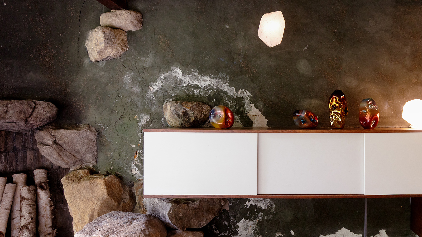 For this exhibition, R & Company presents decorative and illuminated sculptures by Jeff Zimmerman. Known for his use of organic forms and natural patterns, Zimmerman brings movement, texture, and light into his glass works. Installed throughout Manitoga, these pieces amplify the dialogue between nature, the built environment, and the designed object, creating an exhibition where the boundaries between interior and exterior are thoughtfully blurred.