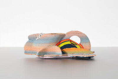Stoneware, glaze, epoxy, wire, luster, and PLA plastic