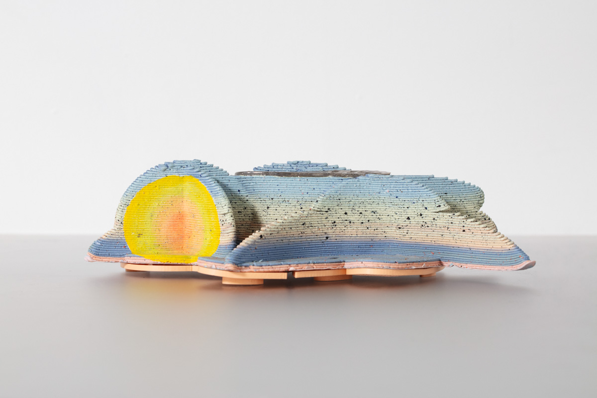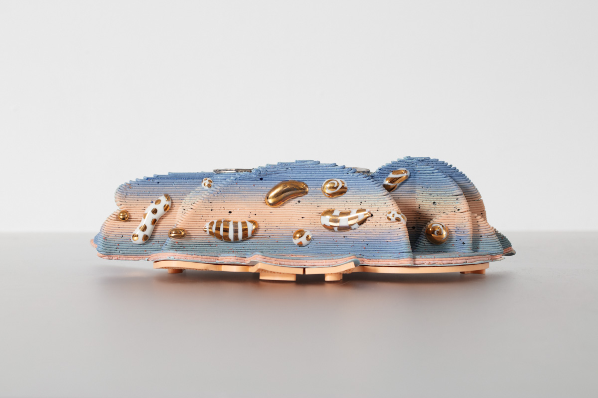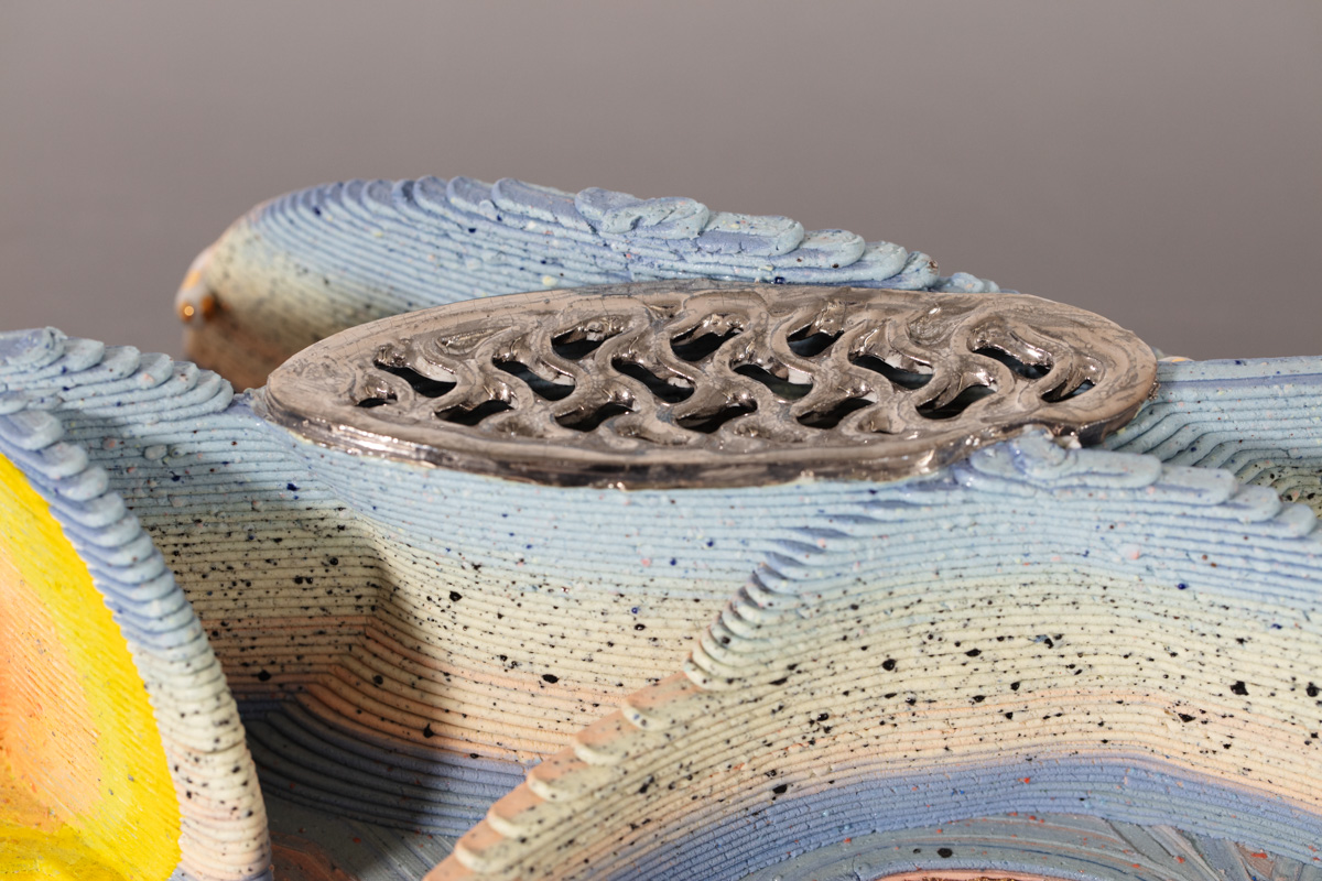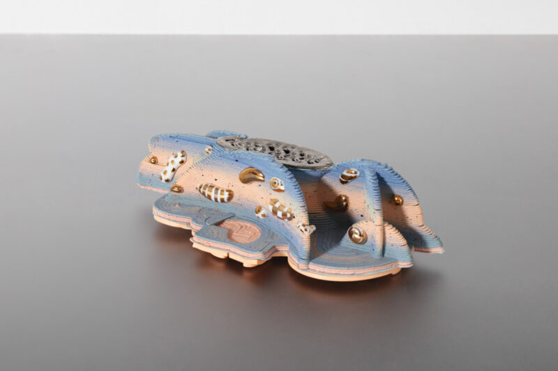 "Memory Palace in Providence Summer," a unique vessel in porcelain, glaze, luster, and PVA plastic. Designed and made by Jolie Ngo, USA, 2022.