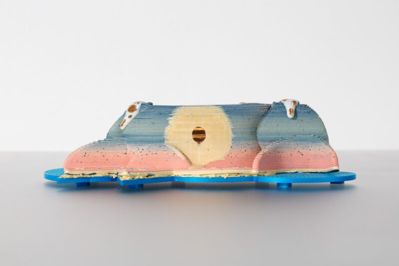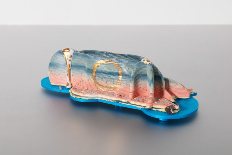 Stoneware, glaze, epoxy, wire, luster, and PLA plastic