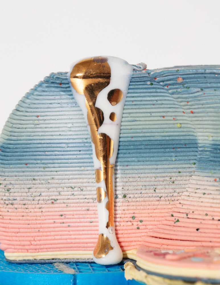 "Memory Palace in Fast and Loose," a unique vessel in porcelain, glaze, luster, and PVA plastic. Designed and made by Jolie Ngo, USA, 2022.