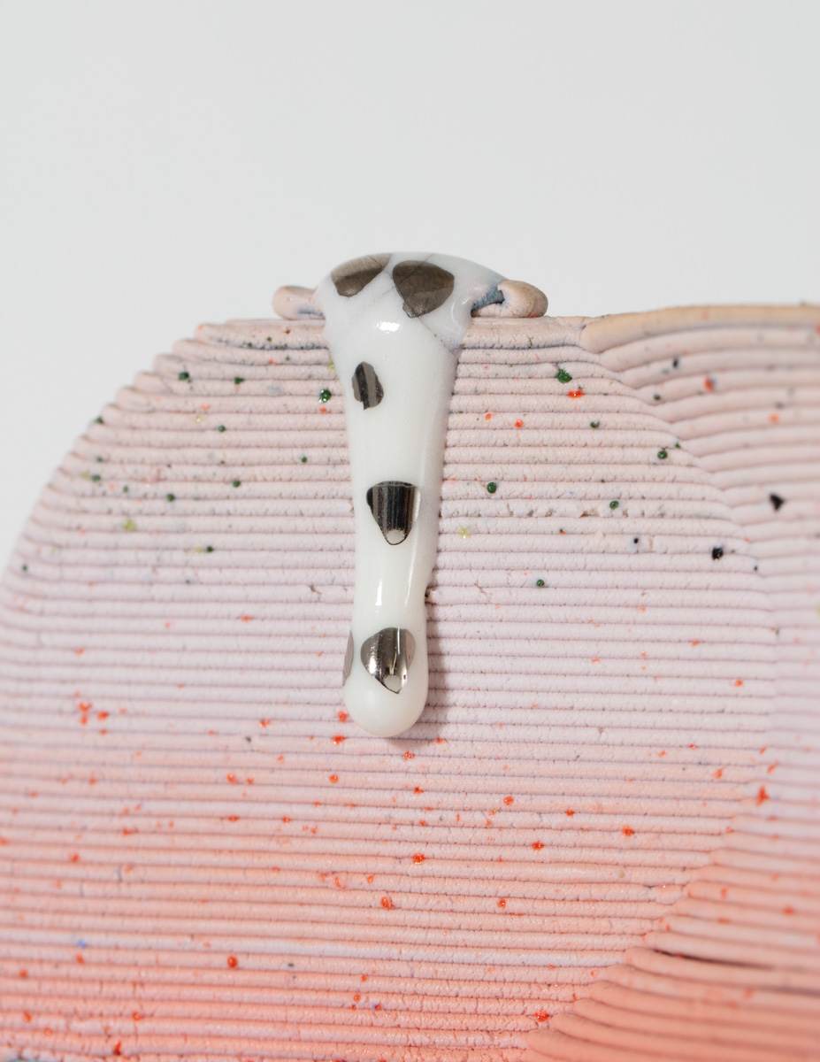 "Sticker Vessel in Baby," unique Sticker vessel in porcelain, glaze, luster, and PVA plastic. Designed and made by Jolie Ngo, USA, 2022.