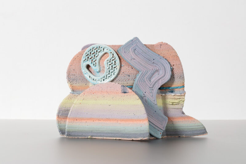 Stoneware, glaze, epoxy, wire, luster, and PLA plastic
