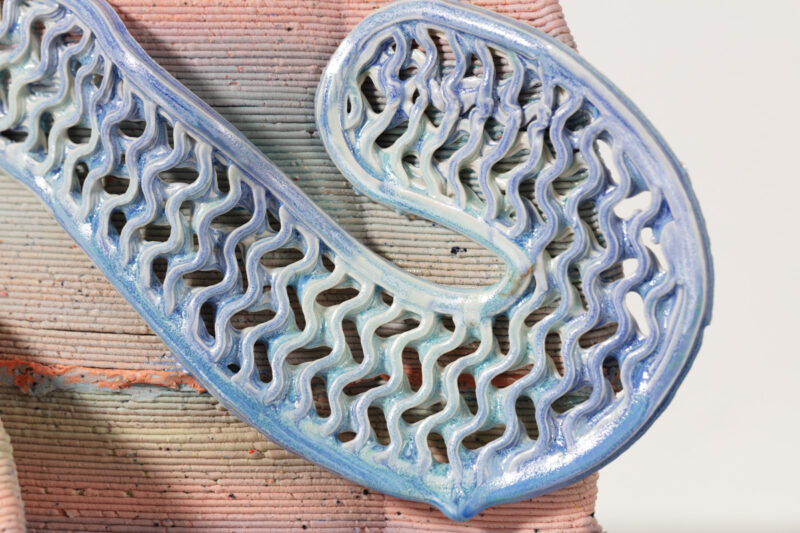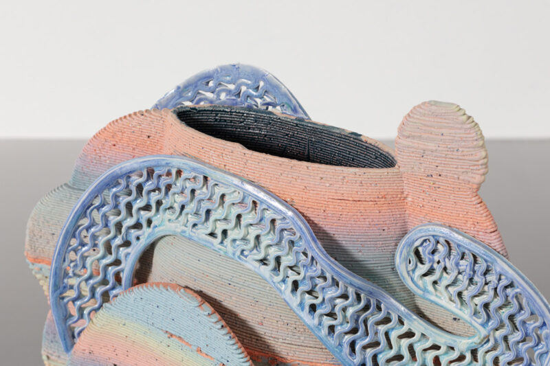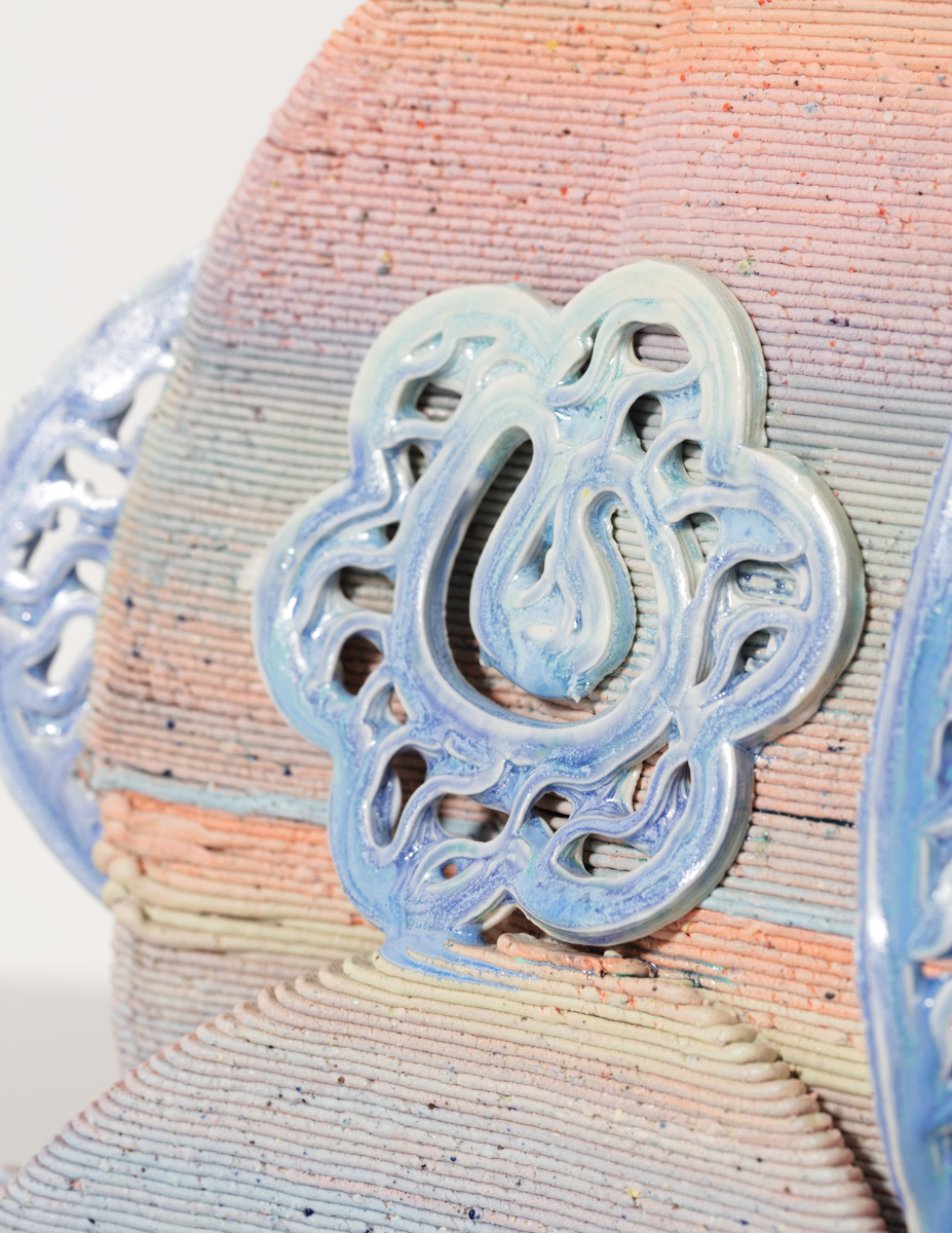 "Sticker Vessel in Drinking Water," a unique vessel in porcelain, glaze, luster, and PVA plastic. Designed and made by Jolie Ngo, USA, 2022.