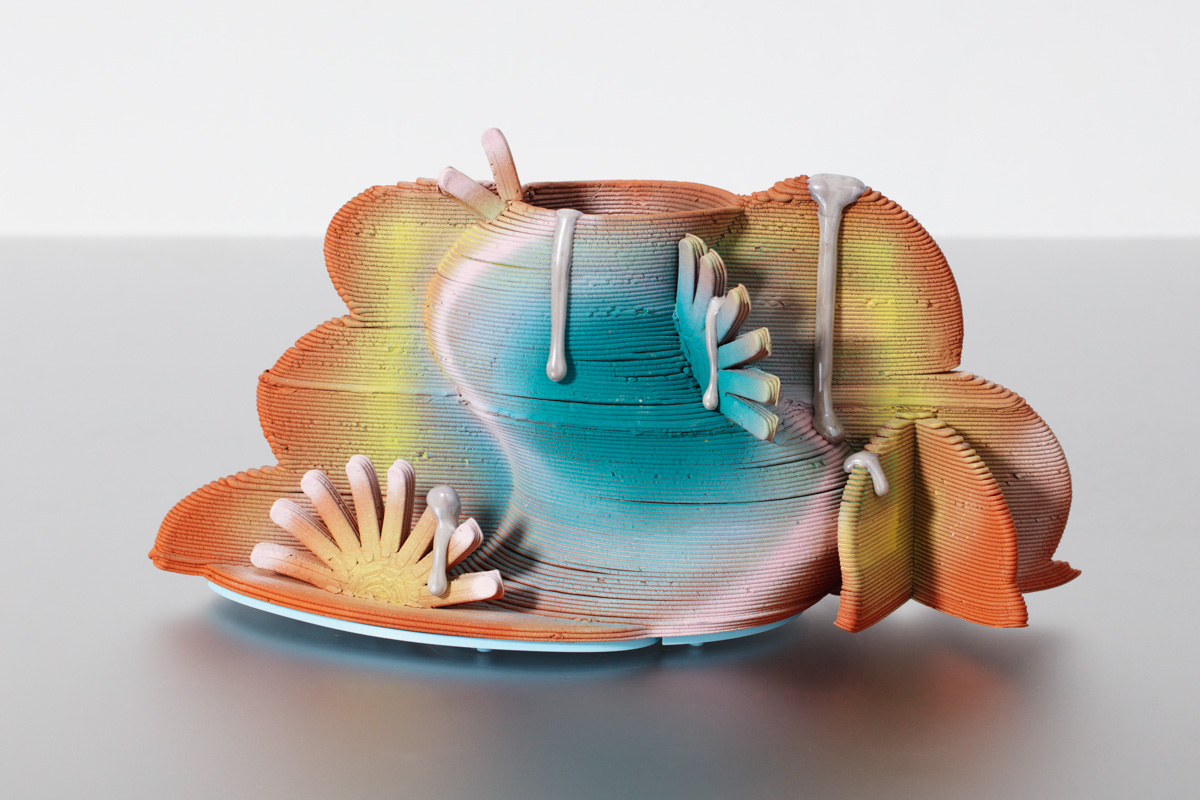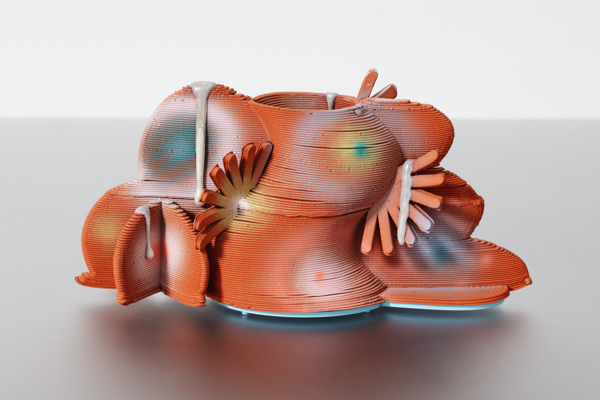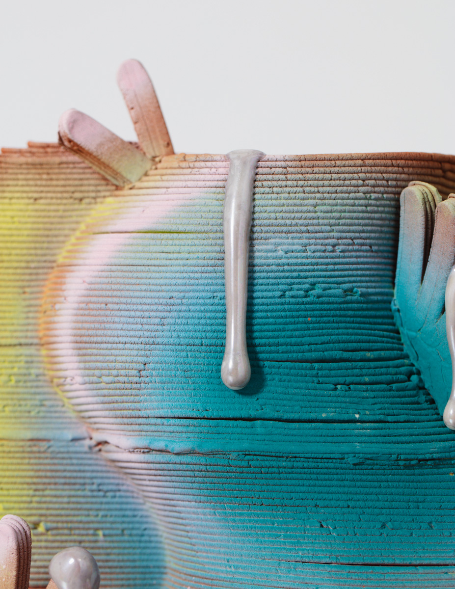 "Memory Palace in Providence Summer," a unique vessel in porcelain, glaze, luster, and PVA plastic. Designed and made by Jolie Ngo, USA, 2022.