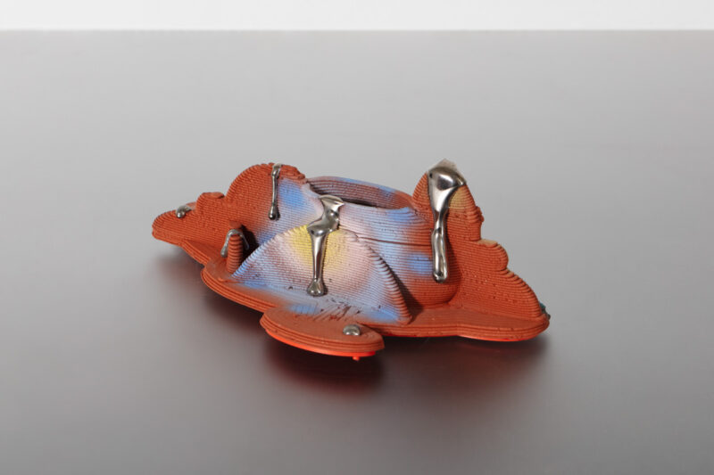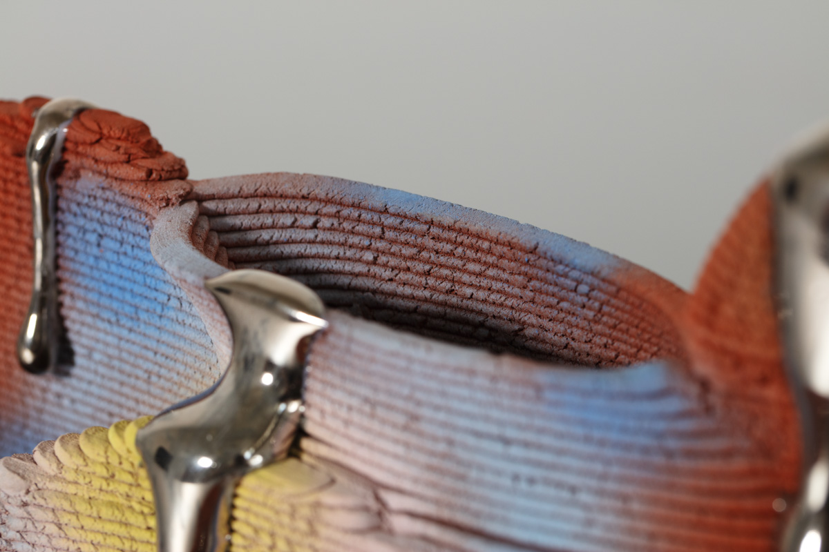 Stoneware, glaze, epoxy, wire, luster, and PLA plastic