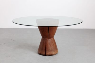 From the 1960s onwards, Jose Zanine Caldas incorporated scraps from deforestation to create what he called “Protest Furniture.” For his iconic masterwork, the “Namoradeira,” or “Tete-a-Tete,” Zanine uses a large section of a felled tree to translate the nineteenth-century French form into the twentieth-century Brazilian design lexicon. Though Zanine carved the “dating chair” from a massive log, the rounded base allows the users to rock back and forth, reinforcing the light, social function of the piece.