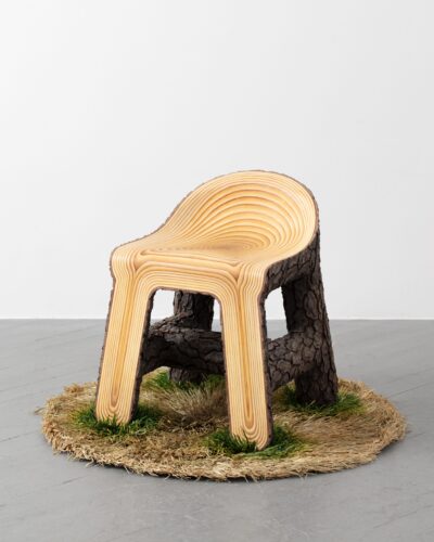 "Burl Chair Bust: Seat" in wood, MDF, paper clay, epoxy, and douglas fir slices with steel (post) and plywood (base). Designed and made by Joyce Lin, USA, 2023.