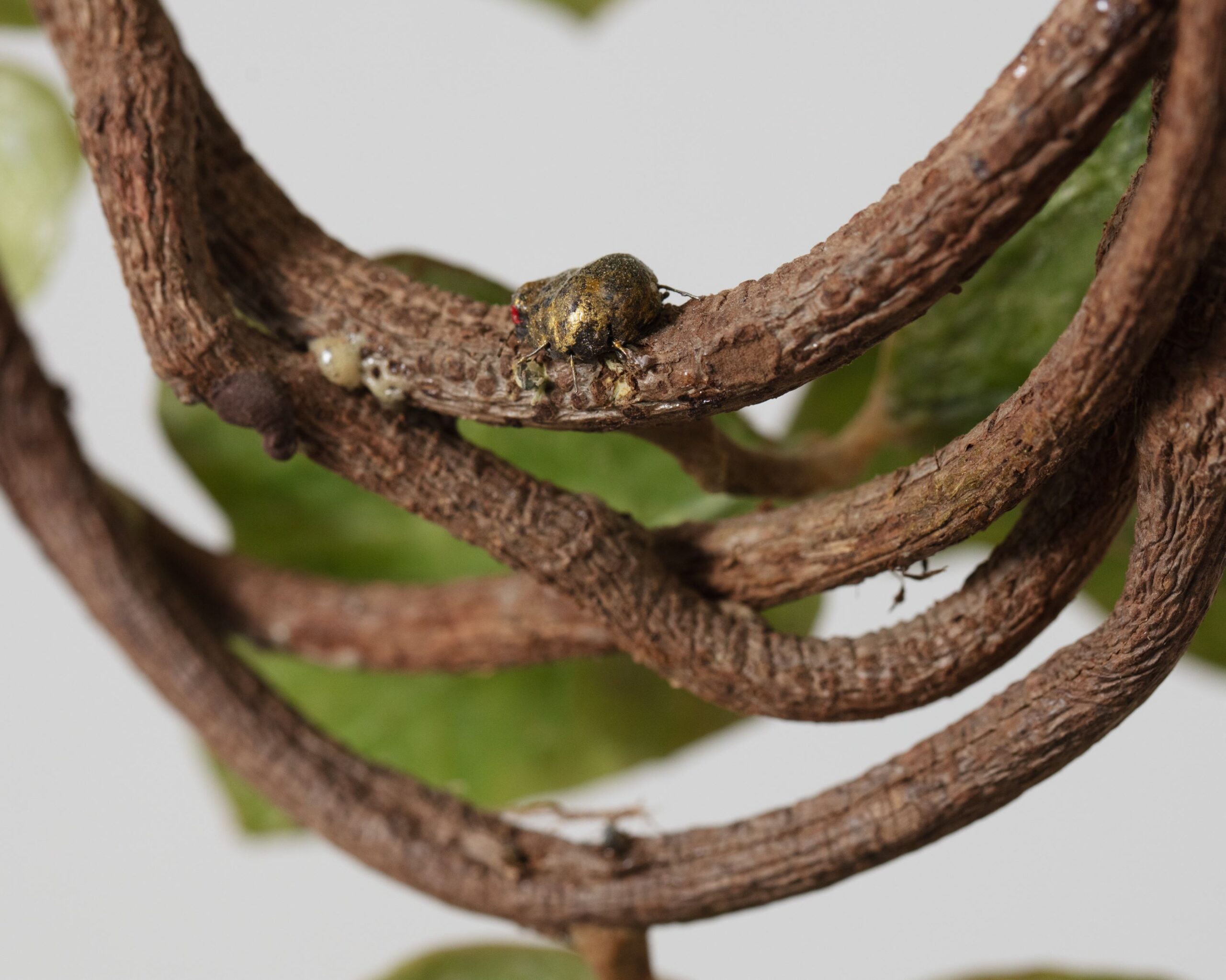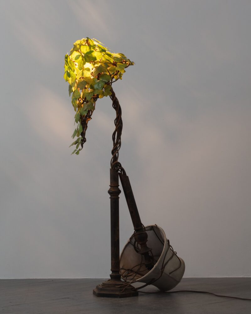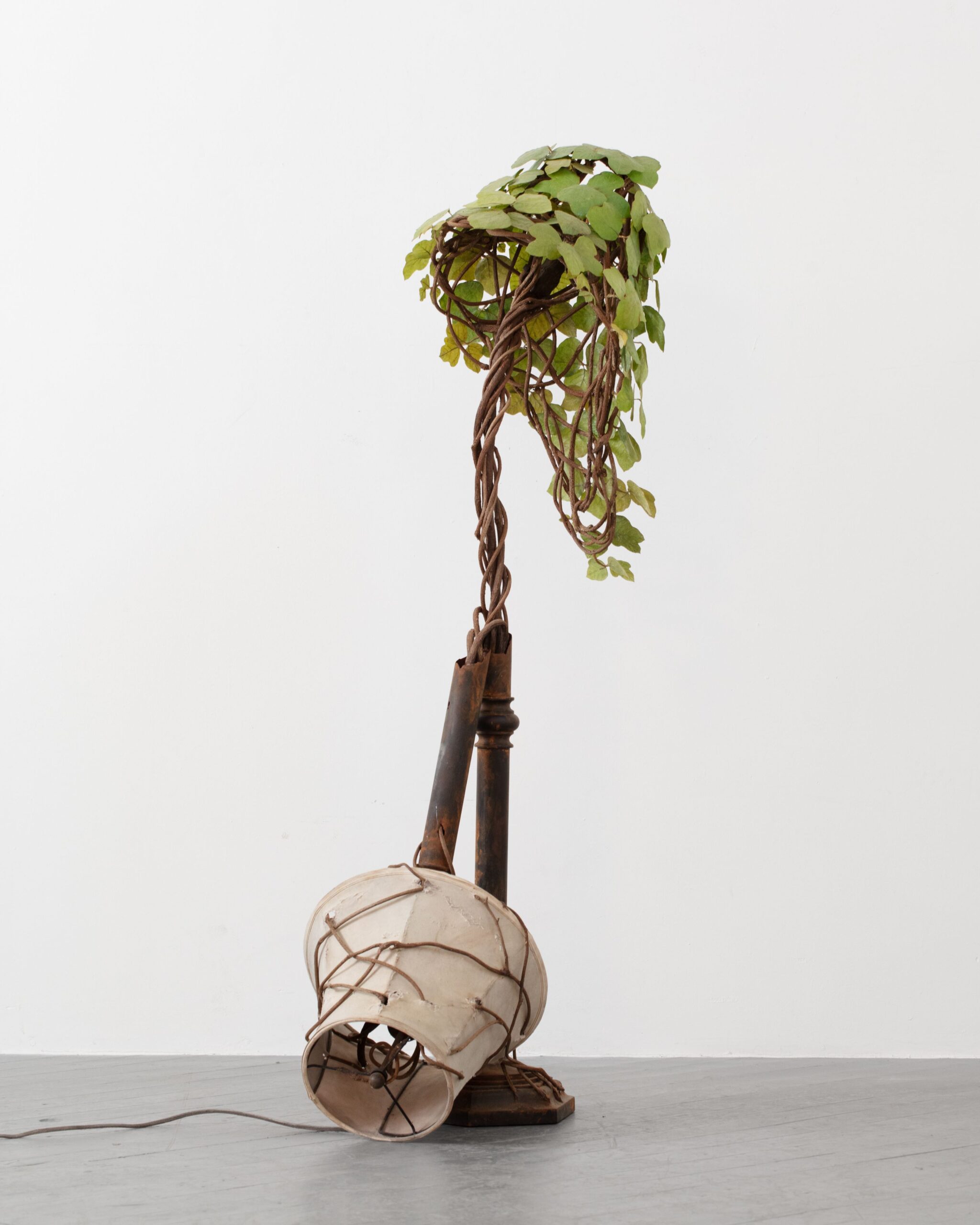 Found lamp, steel, kudzu vine, epoxy, cloth, wire, and paint