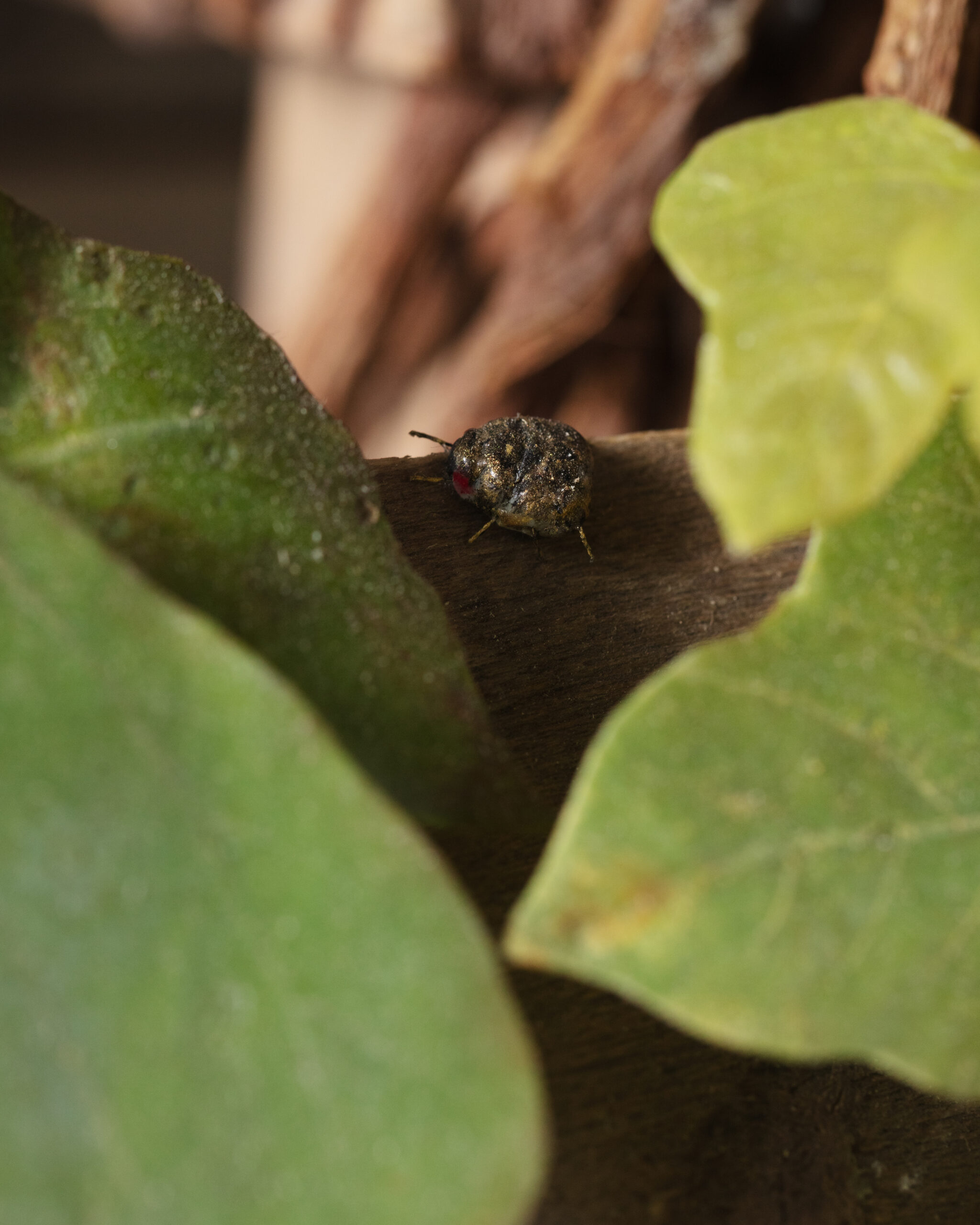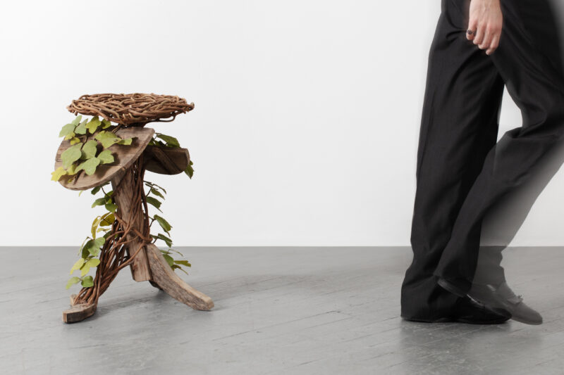 "Burl Chair Bust: Leg" in wood, MDF, paper clay, epoxy, and douglas fir slices with steel (post) and plywood (base). Designed and made by Joyce Lin, USA, 2023.