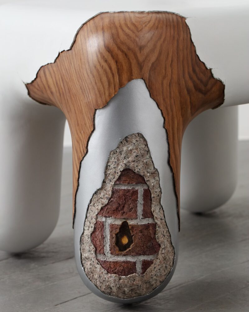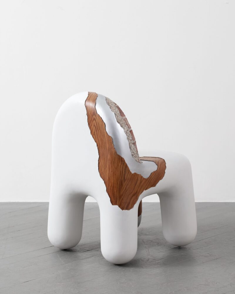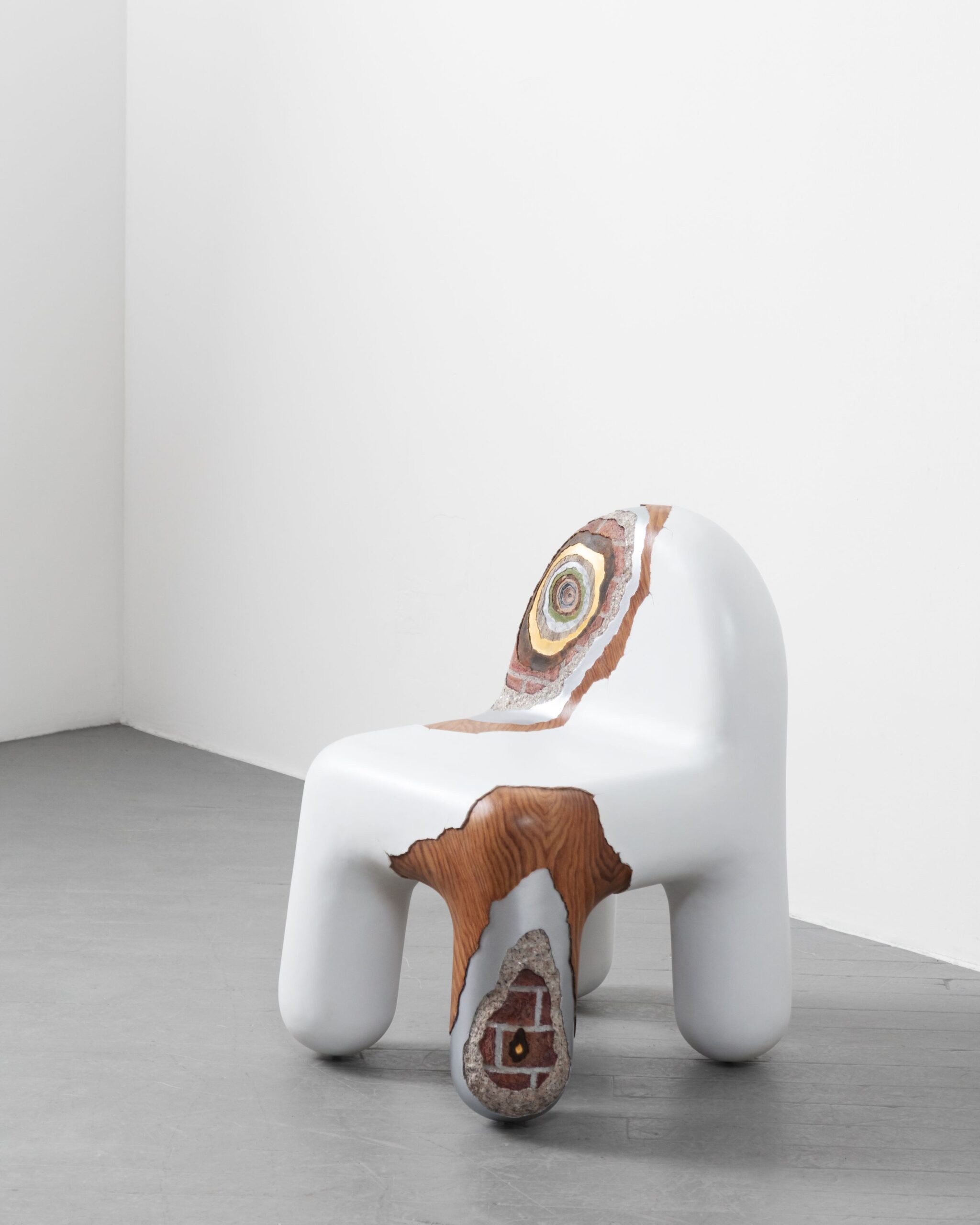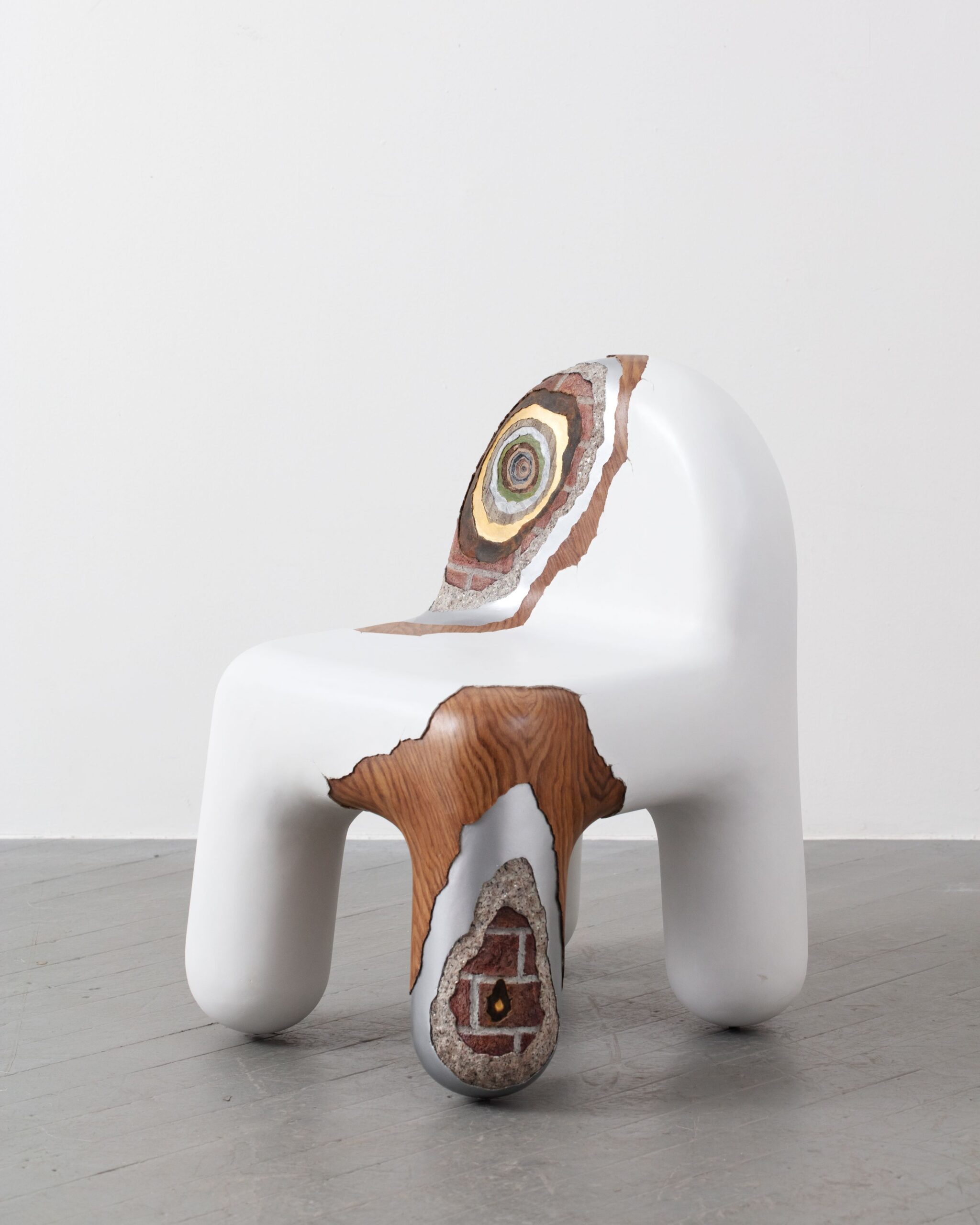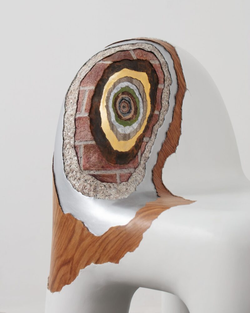"Burl Chair Bust: Seat" in wood, MDF, paper clay, epoxy, and douglas fir slices with steel (post) and plywood (base). Designed and made by Joyce Lin, USA, 2023.