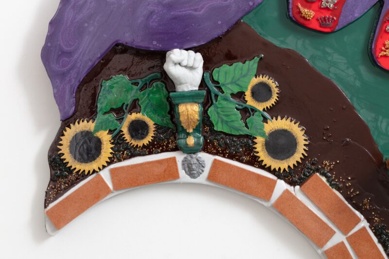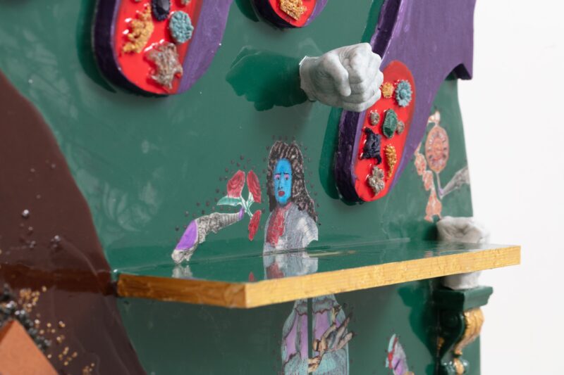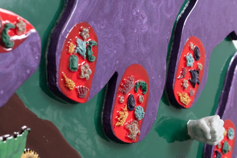 Resin, red and white marble, mineral pigments, acrylic paint, wallpaper fragments, glass shards, synthetic fibers, abalone shell, cristobalite, malachite, blue goldstone, garnet, red dye, aluminum, nails, and plywood