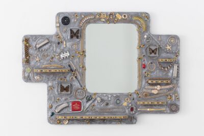 Aluminum, jewelry, watches, musical instruments, upholstery trims, butterflies, candle snuffer, mirror, acrylic paint, resin, and plywood