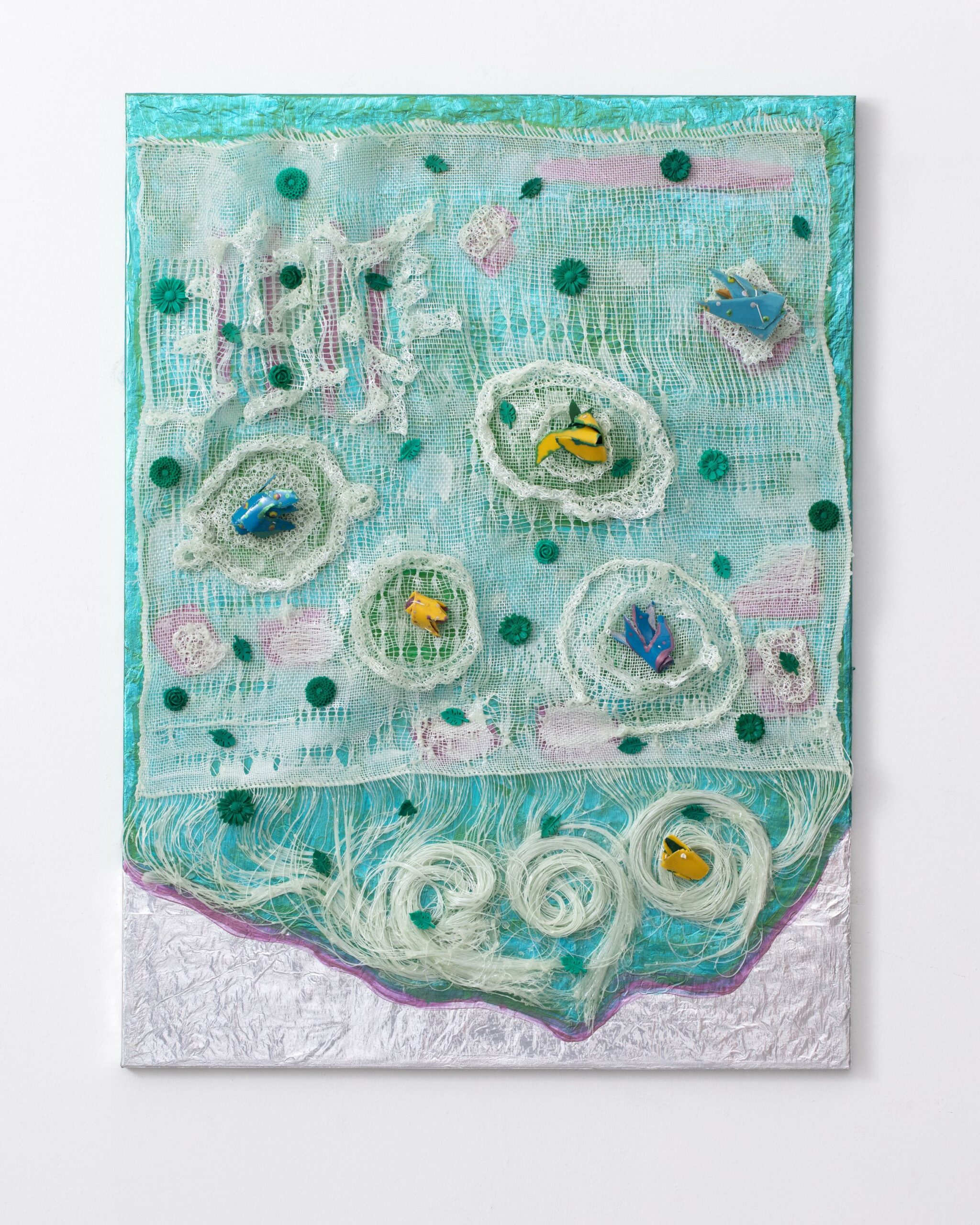 Clay-coated rope, graphite fiber, nylon thread, acrylic paint, pearls, imitation gold leaf, and plywood