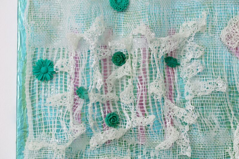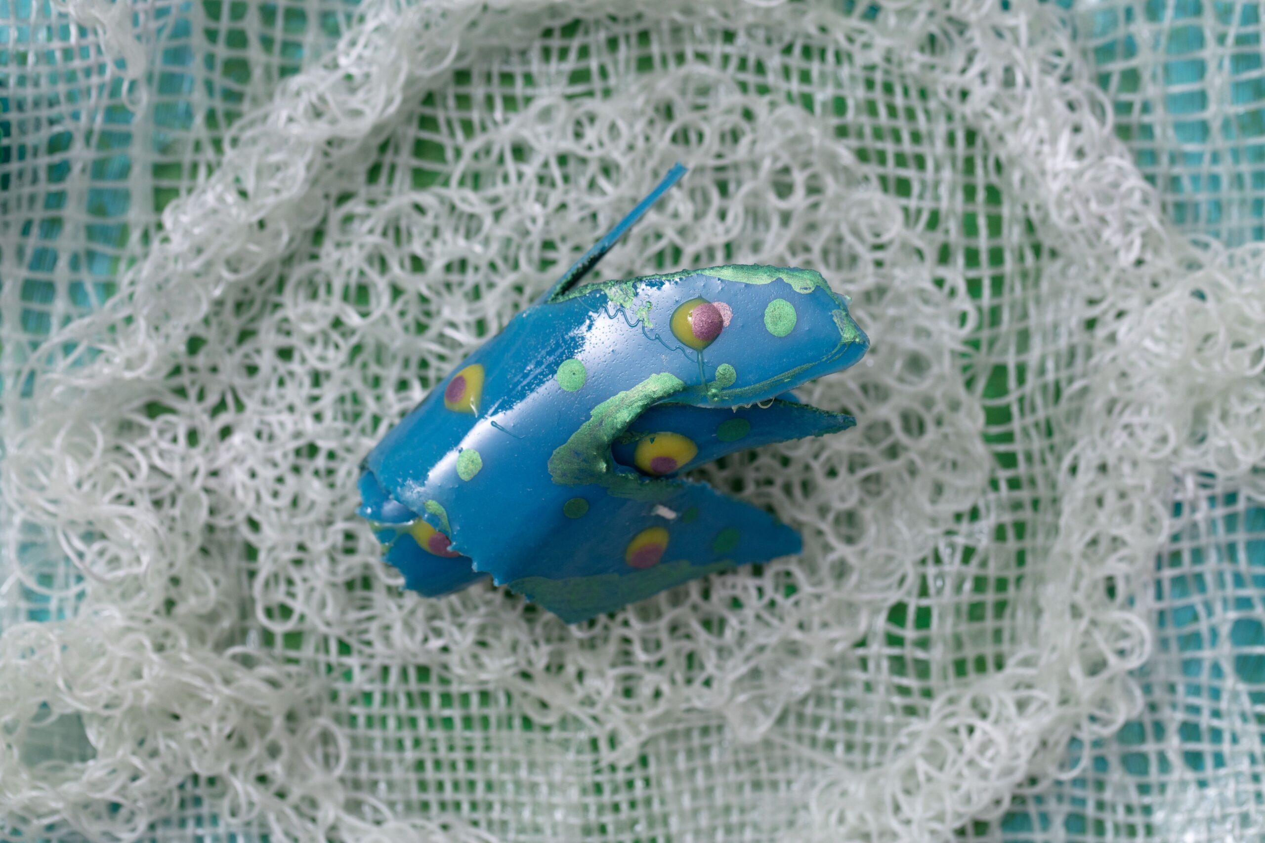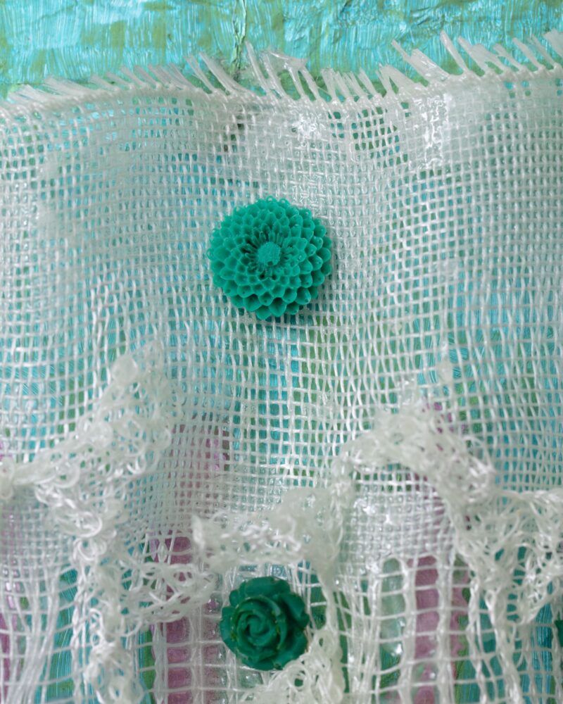 Urethane, polyurethane foam, dyes, acrylic paint, electroplated glass shards, embroidered appliqués, mica, beads