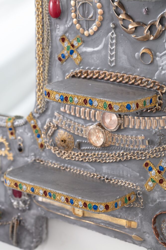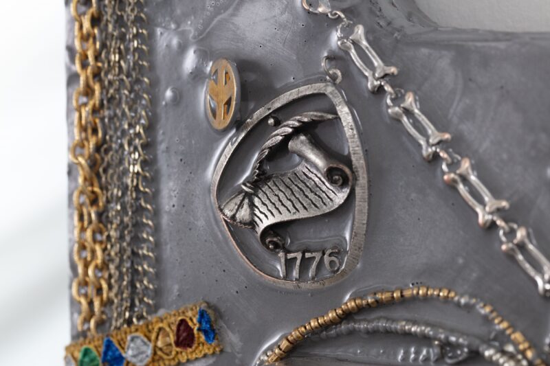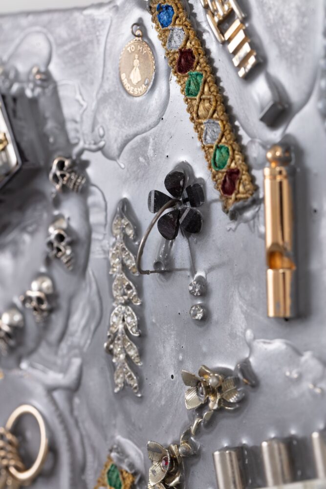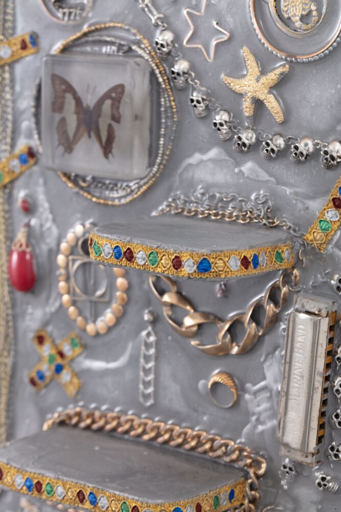 Aluminum, jewelry, watches, musical instruments, upholstery trims, butterflies, candle snuffer, mirror, acrylic paint, resin, and plywood