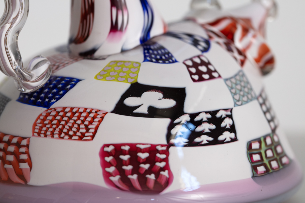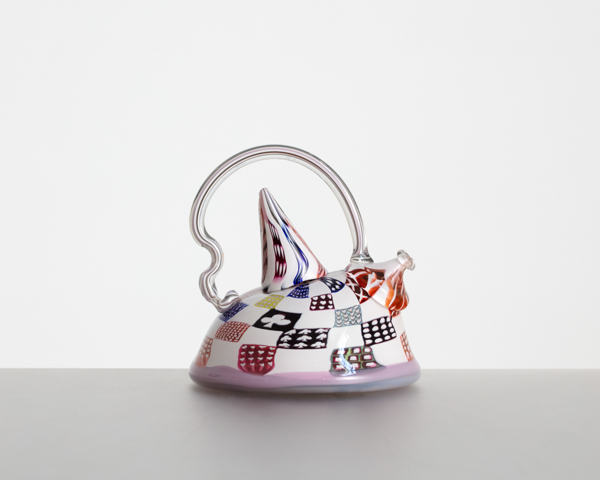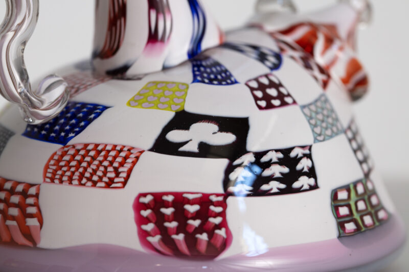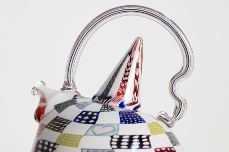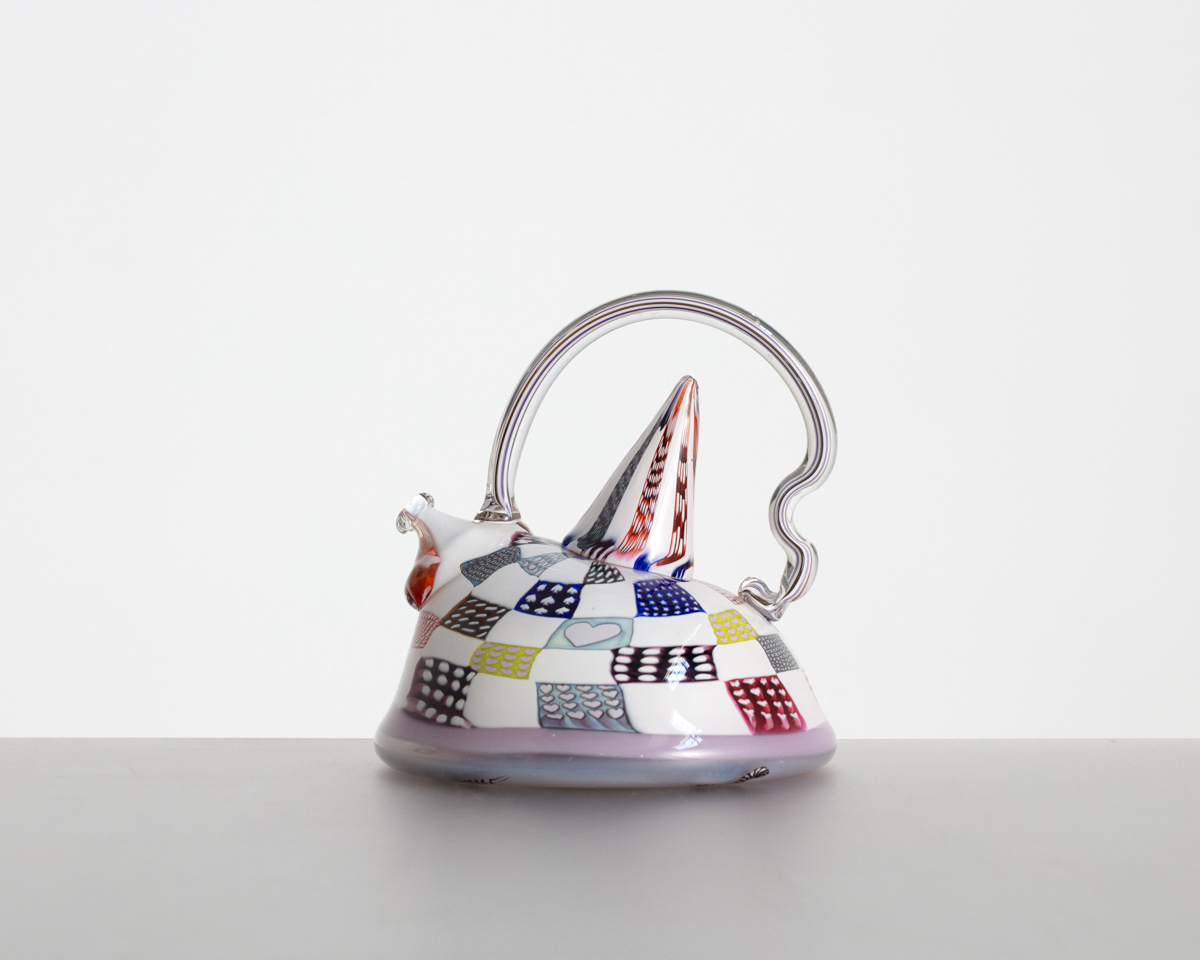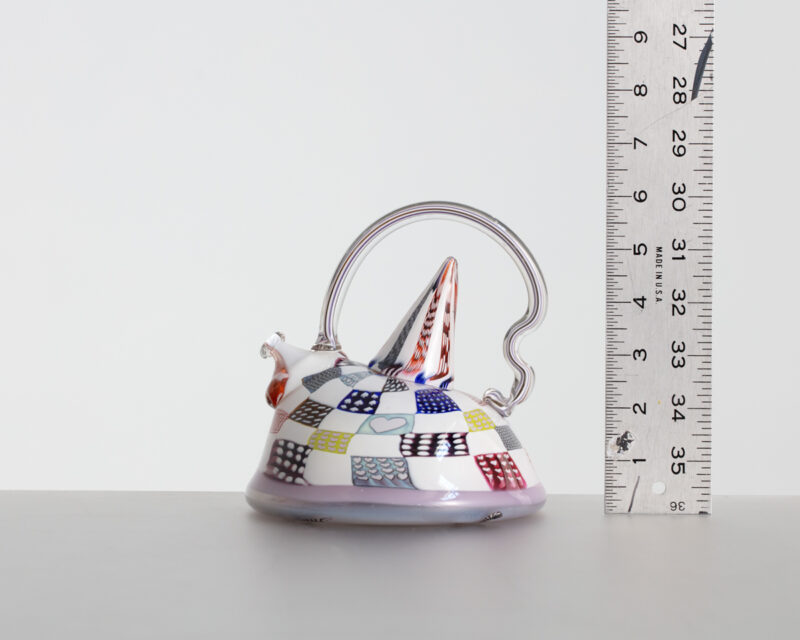 Richard Marquis. "Patchwork Teapot". Nonfunctional object. 1984. Glass. 5.75" x 5.75" x 6.25" H (14.6 x 14.6 x 15.9 cm H) USA. Signed and Dated on underside.