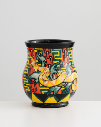 Glazed stoneware, acrylic, enamel, birch, pine, and laquer